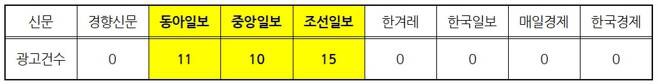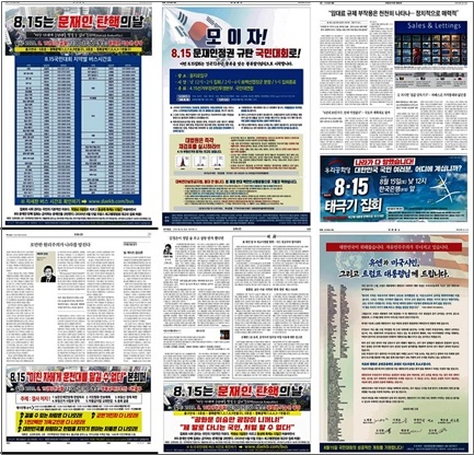 광복절 집회가 열리기 한 달 전인 7월 15일부터 집회 당일인 8월 15일까지 6개 종합일간지와 2개 경제일간지를 조사한 결과에 따르면, 조선일보는 15개(7월 21일~8월 15일), 동아일보는 11개(7월 28일~8월 15일), 중앙일보는 10개(7월 28일~8월 14일)의 광고를 각각 실었습니다.