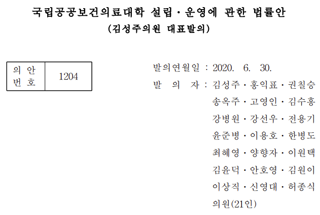 논란이 지금도 되고 있는 법안입니다.. 법안제목은 "국립공공보건의료대학 설립ᆞ운영에 관한 법률안"