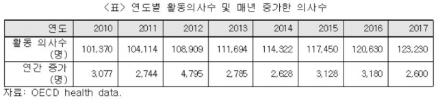 매년 증가하고 있는 의사 수는 의사와 한의사 수를 합해 연간 3000명 내외로, 의대 정원을 통해 배출되는 의사 수보다 적다. 그런데 의사협회는 이보다 2배 가까이 증가할 것이라고 주장했다.