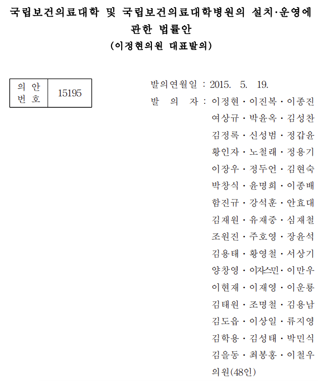 결과적으론 2015년에 발의한 법안은 2020년에 발의된 법안과 같은 공공의대가 아닌 그냥 의대 설립이라 생각합니다. 국립이라 쓰여져 있긴 하지만..
