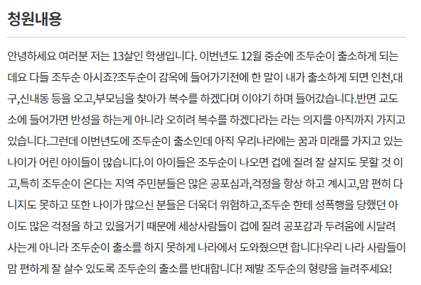 그 중 지난 달 27일 청와대 국민청원 게시판에는 “올해 12월 13일, 모두의 공포 대상인 조두순의 출소일을 막아주세요”라는 제목의 청원이 게시됐다.