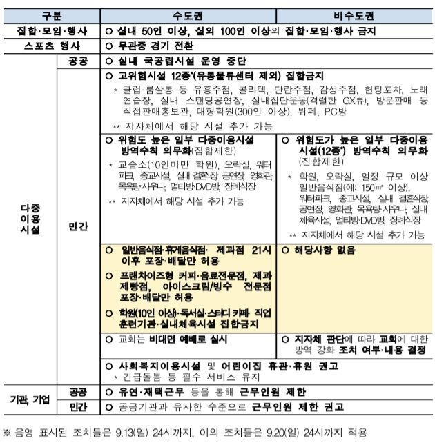 실내 50인, 실외 100인 이상의 집합금지, 클럽, 노래연습장, 뷔페 등 고위험시설 12종과 실내 국공립시설의 운영중단 등의 조치는 그대로 유지된다.