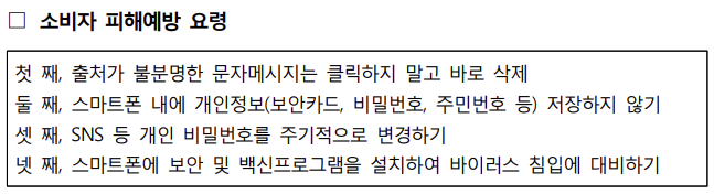또한, 경제적 피해가 의심될 경우 소비자들은 즉시 경찰청 사이버안전국(www.cyberbureau.police.go.kr)에 신고하며, 피해 확산을 방지하기 위해 사기성 문자 메시지 수신 시 정부의 불법스팸대응센터(국번없이 118)에 관련 정보를 제공하는 것이 좋다.