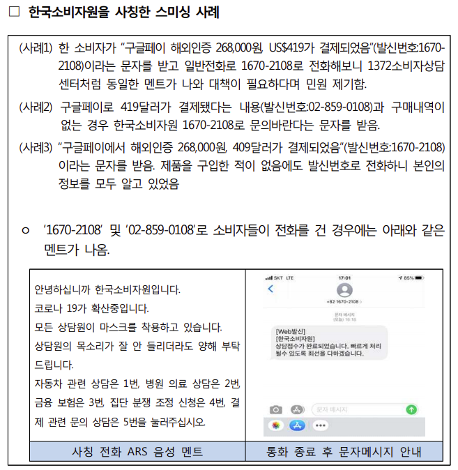 한국소비자원이 확인한 바에 따르면, 소비자에게 “구글페이 등을 통해 제품 구입 및 특정 금액이 결제되었으니 기관 전화번호로 문의바란다”는 문자 메시지를 보내어 이에 현혹되어 전화를 걸 경우 개인정보와 금융정보를 탈취하는 수법을 사용하고 있다. 더욱이 알려준 전화번호(1670-2108, 02-859-0108)로 연락할 경우 1372소비자상담센터와 유사한 ARS멘트를 사용하고 있어 소비자가 속을 우려가 있다.