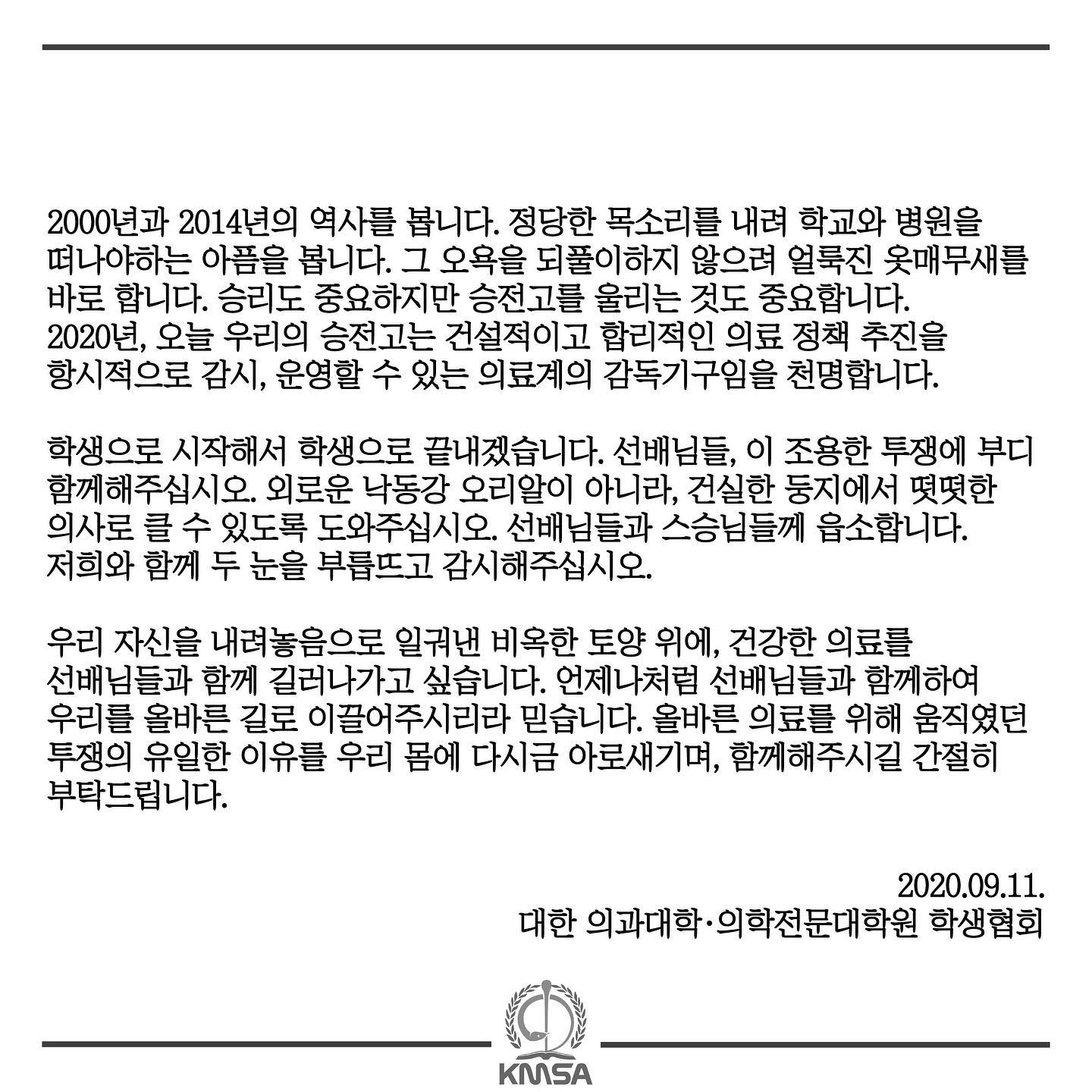 특히 “(의대생) 구제만을 위한 이기적인 투쟁이라며 비난과 질타가 이어진다. 그렇지만 연대를 멈추지 않았다”며 “흐트러지지 않는 오와 열로, 온전히 스스로의 권리인 수업 거부와 동맹 휴학, 국가시험 거부를 유지했다”고 강조했다.