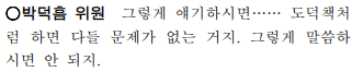 이에 박 의원은 “도덕책처럼 하면 다들 문제가 없는 거지. 그렇게 말씀하시면 안 되지”라며 김 차관을 나무라는 투로 말했고 김 차관은 즉각 ‘공정위 과징금 처분도 건설공사가 제일 많다. 이런 상황에서 2015년 건설업계에서조차 삼진아웃제를 강화하기로 자정결의를 한 바 있다’는 취지로 반박에 나섰다.