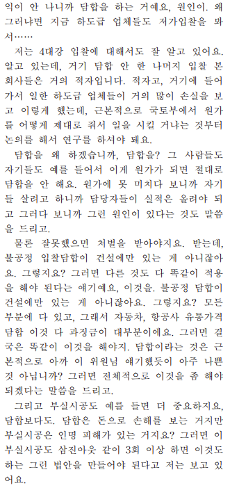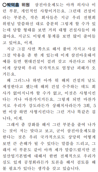 그러자 또다시 박 의원은 “자꾸만 처벌, 처벌만 생각하지 마시고 근본적인 원인을 생각하라… 결국 공사금액이 적어서 담합을 하는 거”라며 “토론회 공청회를 거쳐서… 지금 빨리 급한 게 아니잖냐”고 속도조절론을 내세웠다. 업계에선 관급공사의 경우 어음결제 없이 현금으로 공사비가 지급되고 마진율도 일반 건설공사(아파트 5%)에 비해 높은 편(15%)이라고 알려져 있다.