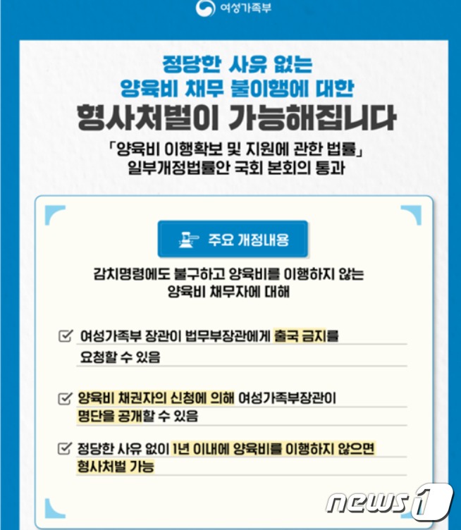 여성가족부(장관 이정옥)는 이 같은 내용이 포함된 '양육비 이행확보 및 지원에 관한 법률 개정안'이 국회 본회의를 통과했다고 9일 밝혔다.