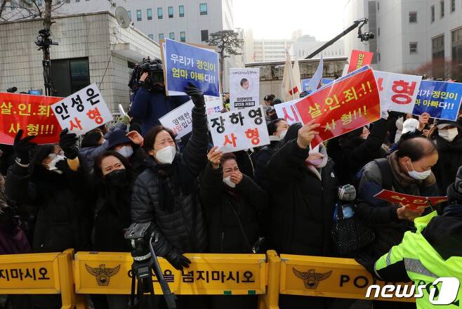 이날 법원 앞에는 아침부터 장씨와 A씨를 엄벌에 처해야 한다고 주장하는 시위대 수십명이 몰렸다.