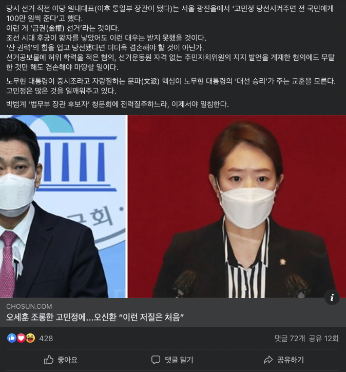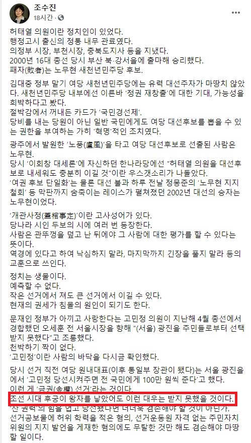 조 의원은 이어 “당시 선거 직전 여당 원내대표(이후 통일부 장관이 됐다)는 서울 광진을에서 '고민정 당선시켜주면 전 국민에게 100만 원씩 준다'고 했다. 이런 게 '금권(金權) 선거'”라고 주장하면서 문제의 발언을 썼다. 그는 “조선 시대 후궁이 왕자를 낳았어도 이런 대우는 받지 못했을 것”이라며 “'산 권력'의 힘을 업고 당선됐다면 더더욱 겸손해야 할 것이 아닌가”라고 막말을 했다.