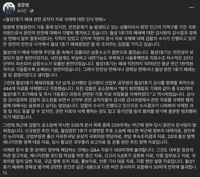 윤 의원은 이날 자신의 사회관계망서비스(SNS)를 통해 검찰 공소장 가운데 월성1호기 조기폐쇄 및 즉시 가동중단 과정과 관련해 공무원이 삭제한 530개의 파일 중 220여개는 박근혜 정부 당시 원전국 문서라고 밝혔다.