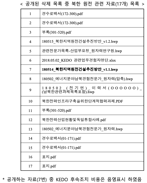 ※ 북한 원전 관련 자료로 예시된 17개 파일의 경우 산업부가 작성한 자료는 ‘북한 지역 원전건설 추진방안’, ‘에너지분야 남북경협 전문가’ 2개로 파악되며 나머지 자료들은 ‘95년부터 추진된 KEDO 관련 공개 자료와 전문가 명단으로 파악됩니다.
