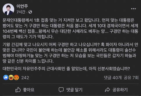 결국 이언주 예비후보는 방역당국의 접종순서를 무시한 발언입니다.. 만약 대통령이 그 순서를 무시하고 우선 접종을 받았다면 아마 보수진영에선 대통령이 국민보다 먼저 살겠다고 백신접종을 먼저 받았다 비난했을 겁니다..
