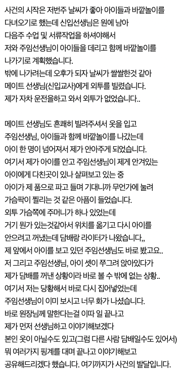 A씨는 "여기까지가 사건의 발단"이라며 "저희 주임섬생님은 담배 피는 사람 자체를 혐오하며 담배 피는 건 있을 수 없는 일이라고 생각한다"고 덧붙였다. 그리고 주임선생님은 바로 원장님께 전달했고 원장님과 신입교사는 한 시간 동안 개인 면담을 했다고 적었다.