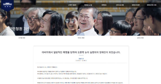 앞서 지난 12일 청와대 국민청원 게시판에 '아버지께서 일방적인 폭행을 당하여 오른쪽 눈이 실명되어 장애인이 되었습니다'란 제목의 청원이 올라왔다.