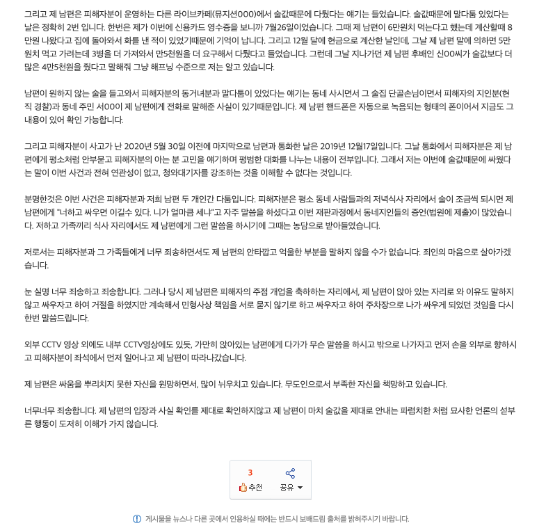 저로서는 피해자분과 그 가족들에게 너무 죄송하면서도 제 남편의 안타깝고 억울한 부분을 말하지 않을 수가 없습니다. 죄인의 마음으로 살아가겠습니다.