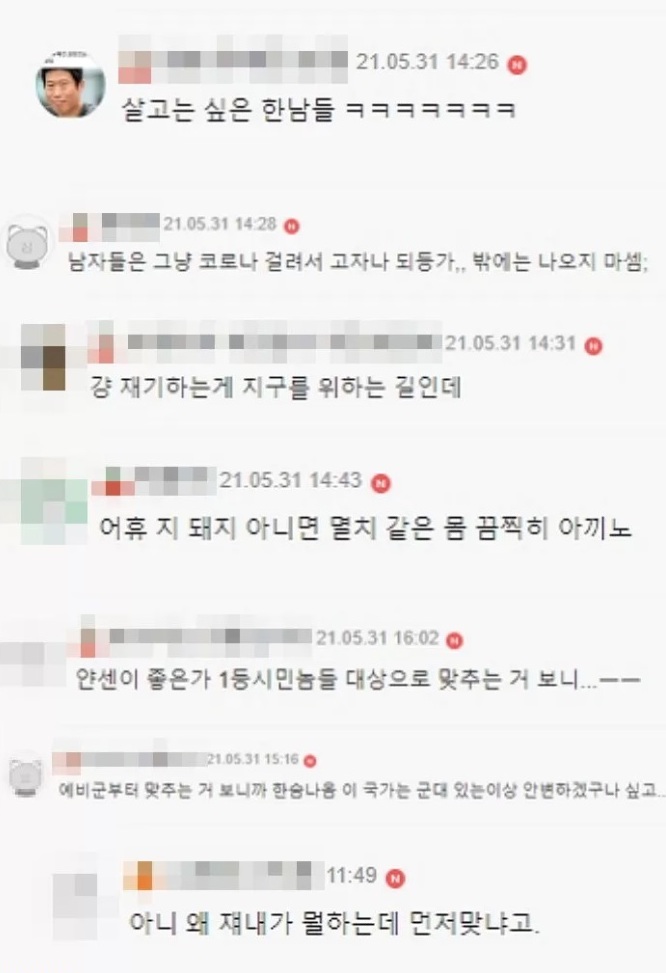 이런 상황인데.. 예비군과 민방위가 접종을 받는다고.. 그걸 남성이 먼저 접종을 받고 여성을 차별한다고 여성들이 이용하는 커뮤니티 사이트 및 카페등에서 언급이 되나 봅니다.