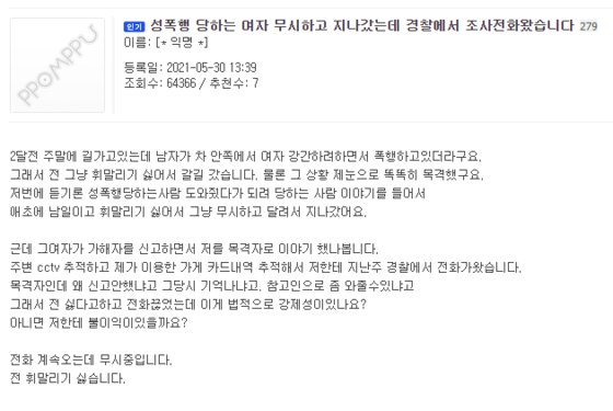 지난달 30일 온라인커뮤니티 뽐뿌에는 익명의 네티즌이 위와 같은 글을 올렸다. 그는 “두 달 전 길 가고 있는데 남자가 차 안쪽에서 여자 강간하려 하면서 폭행하고 있었다”며 “물론 그 상황을 제 눈으로 목격했지만 성폭행당하는 사람 도와줬다가 되레 당했다는 사람 이야기를 들어 휘말리기 싫어 무시하고 갈 길 갔다”고 밝혔다.