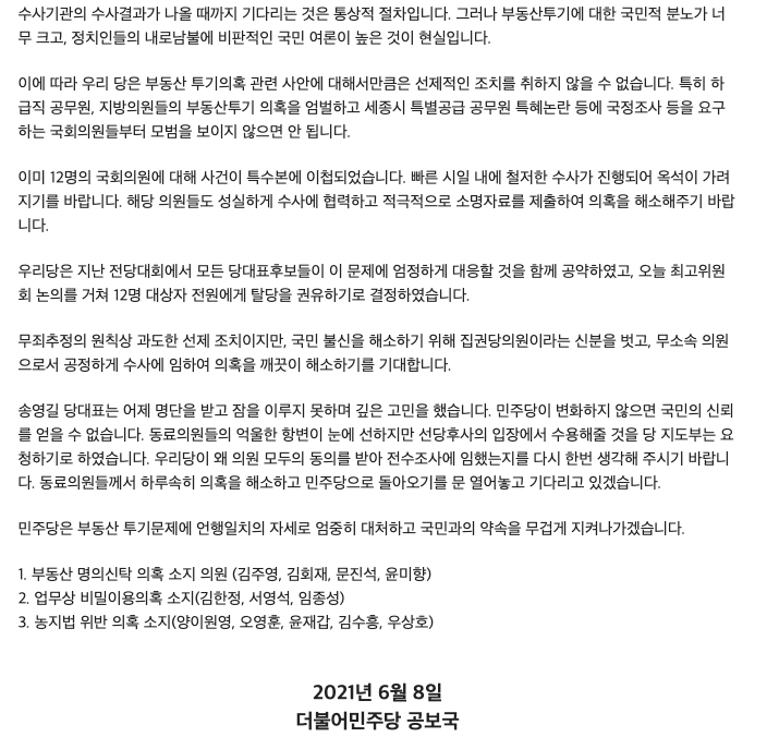 그러면서 "동료의원들께서 하루속히 의혹을 해소하고 민주당으로 돌아오기를 문 열어놓고 기다리고 있겠다"며 "민주당은 부동산 투기문제에 이제까지 그래왔듯 언행일치의 자세로 엄중히 대처하고 국민과의 약속을 무겁게 지켜나가겠다"고 덧붙였다.