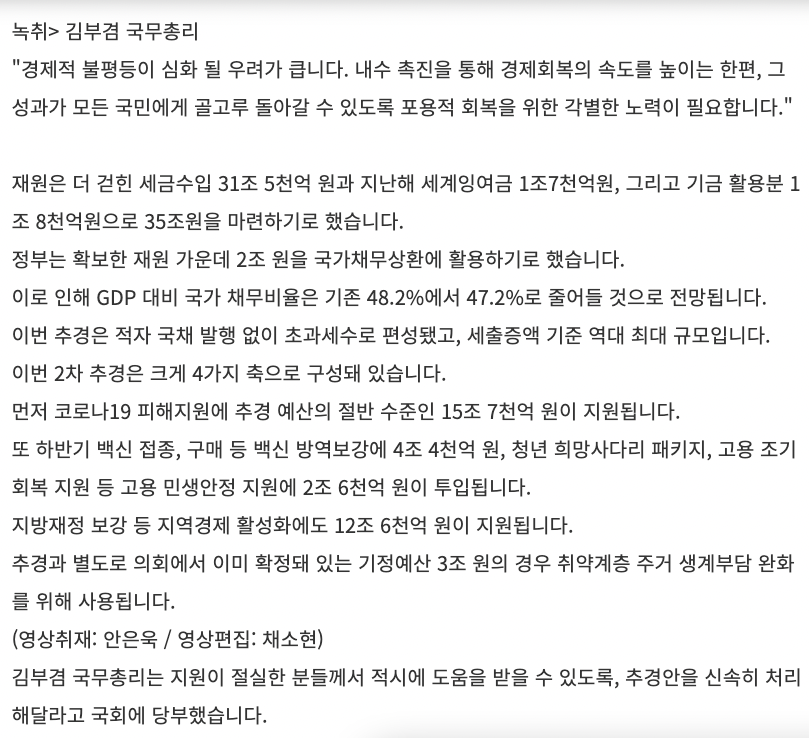 빚 갚고.. 코로나 백신 구매와 접종에 쓰이고.. 민생지원에 쓰입니다.. 7월 1일에 국무회의에서 나온 내용입니다.. 이거 국민의힘에서 봤는지 묻고 싶네요..