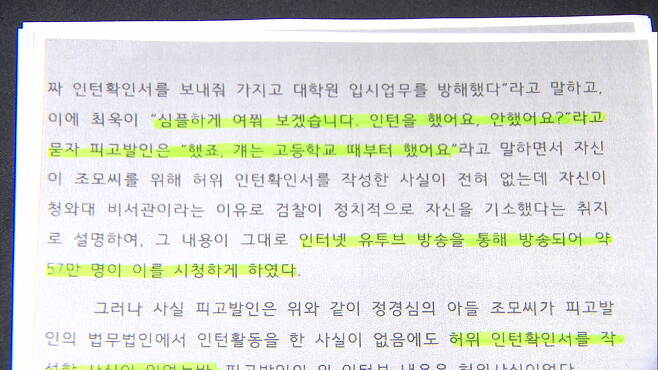 후보자인 피고발인이 국회의원 선거가 임박한 시점에서 자신의 도덕성 등에 치명타가 될 수 있는 허위 인턴증명서 작성사실 유무에 대해 위와 같이 거짓 해명한 행위는 공직선거법 제250조 제1항을 위반한 허위사실공표죄에 해당하므로 피고발인을 신속히 조사하여 처벌해 주시기를 바랍니다.