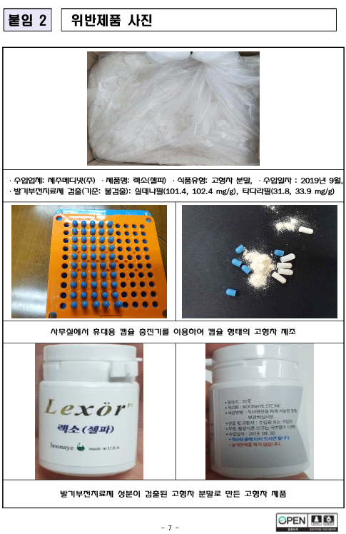 ○ 식약처는 일부 업체가 발기부전치료제 성분이 포함된 건강기능식품을 판매한다는 정보를 입수하고, 인터넷 쇼핑몰에서 “남성 스테미너”, “발현시간 2시간 후” 등의 성기능 강화를 암시하는 내용으로 광고한 ‘렉소(건강기능식품)’* 제품을 수거‧검사해 실데나필 93.6mg/g과 타다라필 30.0mg/g이 함께 검출됐음을 확인했습니다.