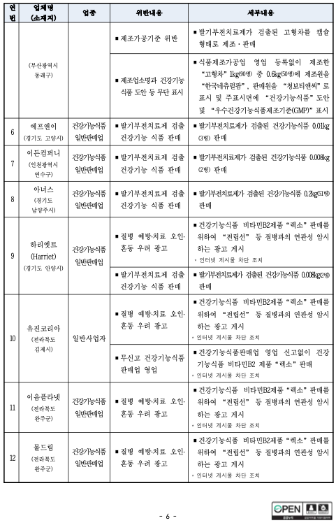 □ 주요 위반내용은 ▲발기부전치료제 성분 검출 건강기능식품 제조‧판매 ▲무등록 식품제조‧가공업 영업 ▲제조‧가공기준 위반 식품 제조‧판매 ▲수입식품 원재료명을 사실과 다르게 신고 ▲질병 예방‧치료 오인‧혼동 광고 등입니다.