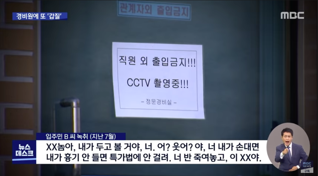 [입주민 B씨 녹취 (지난 7월)] "XX놈아, 내가 두고 볼 거야, 너. 어? 웃어? 야, 너 내가 손대면 내가 흉기 안 들면 특가법에 안 걸려. 너 반 죽여놓고, 이 XX야."