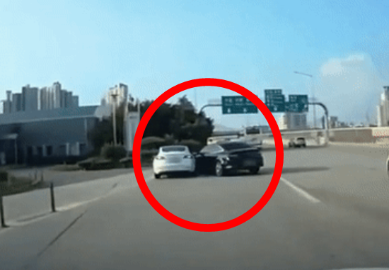 영상에 따르면 지난달 5일 오후 5시쯤 수원신갈IC 부근 고속도로 톨게이트를 빠져나온 흰색 테슬라 차량은 가로지르듯 대각선 방향으로 끼어든 검은색 기아 K5 차량과 추돌했다.