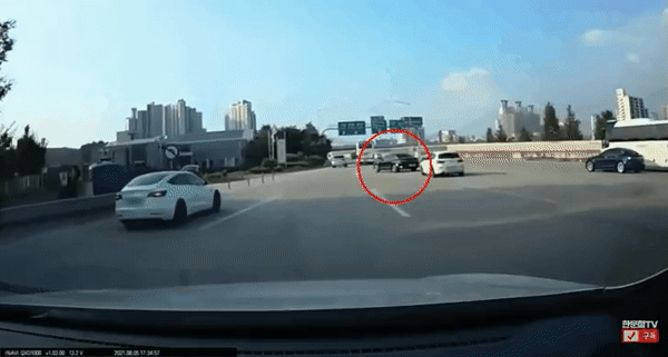고속도로에서 K5의 갑작스러운 차선 변경으로 테슬라 차량이 전복하는 사고가 발생했다.