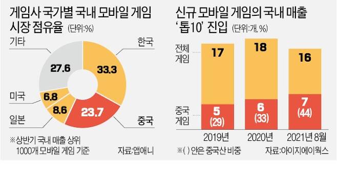 중국이 국내 게임 시장을 급속히 잠식하고 있다. 올해 매출 최상위권에 이름을 올린 신규 모바일 게임 수가 역대 최고치를 기록했다. 절반가량이 중국산이다. ‘세계 최강’으로 불리던 한국 게임사들이 주 52시간 근로제 등 개발 환경 변화와 신규 블록버스터 개발 실패, 해외 진출 난조 등으로 주춤거린 사이 벌어진 일이다.