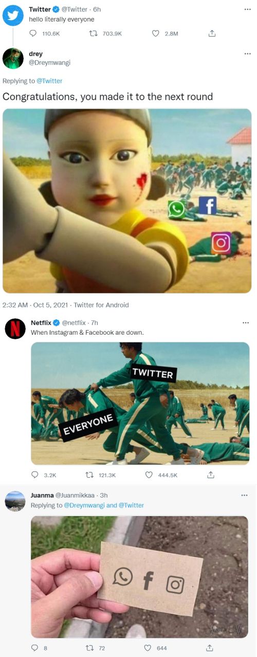 NYT는 인터넷 서비스가 중단되는 것은 특별한 일이 아니라면서도 세계 최대 소셜미디어 업체의 앱 여러 개가 동시다발적으로 먹통이 되는 것은 대단히 이례적인 일이라고 지적했다. 페이스북이 먹통이 되자 이용자들이 트위터로 몰려가 이번 사태에 대해 불만을 터뜨리거나 놀림감으로 삼으면서 ‘#페이스북다운(facebookdown)’이란 해시태그도 인기를 끌었다.