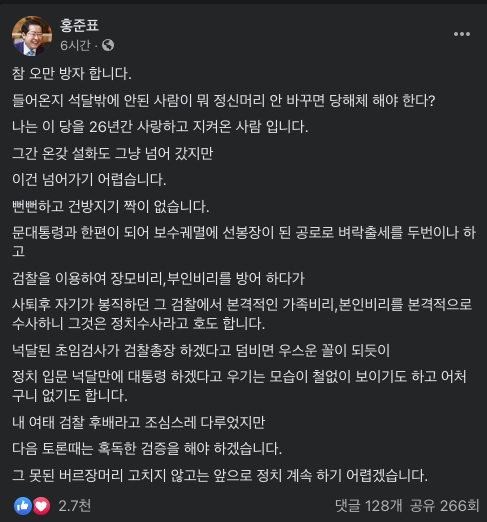 홍준표 "그 못된 버르장머리 고치지 않고는 앞으로 정치 계속 하기 어렵겠다."