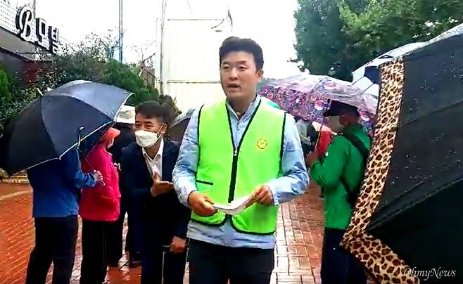 뒤이어 윤 의원은 먹을거리가 담긴 봉지를 받기 위해 두 줄로 서 있는 어르신들 사이를 지나가며 인사했다. 마스크를 쓰고 수행하던 사람은 옆에서 "국회의원 윤영석 입니다"며 소개하기도 했다.