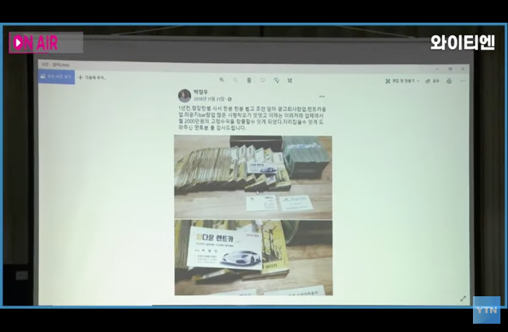 하지만 김 의원이 공개한 현금 다발 사진은 박씨가 지난 2018년 11월 자신의 페이스북 계정에 게시한 사진인 것으로 드러났다.