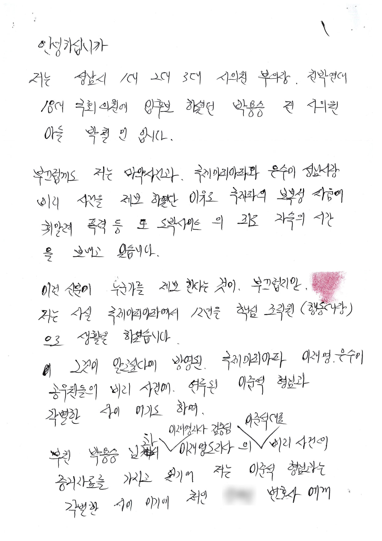 박씨와 소통하는 장 변호사는 이날 중앙일보와의 통화에서 "박씨가 증언 신빙성을 높이기 위해 본인 얼굴과 문신까지도 모자이크 없이 공개해도 된다고 허락했다"며 "증언이 허위사실일 경우 허위사실유포에 의한 명예훼손 등의 처벌을 얼마든지 받겠다고 했다"고 전했다.