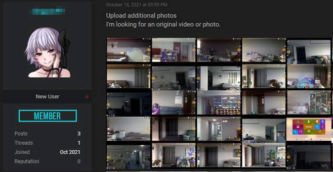 개인정보 거래를 전문으로 하는 해외 해킹 웹사이트에 우리나라 아파트 내부로 추정되는 사진이 무더기로 유통되고 있다. 이들 사진에는 소파에 앉거나 누워 있는 모습, TV를 보거나 식사를 하는 모습, 집안을 오가는 모습을 비롯해 현관 카메라에 비친 얼굴 전면까지 그대로 포함됐다. 사진 상단에는 촬영 시점을 나타내는 시각이 표기된 상태로 공격자가 단순히 특정 순간을 엿본 것이 아닌 동영상으로 생중계 중인 화면을 일부 캡처한 것으로 파악됐다.