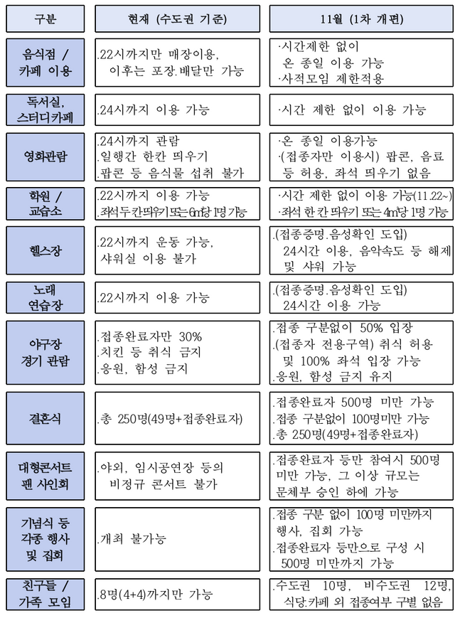 우선 1차 개편이 이뤄지는 다음 달 1일부터 접종 여부와 관계없이 수도권에서 10명, 비수도권에서 12명까지 모일 수 있다.