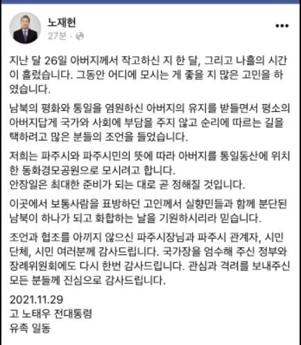 고인의 아들 노재헌 변호사는 오늘 유족 일동 명의의 입장문을 내고 노 씨를 경기 파주시 동화경모공원에 안치하기로 했다고 밝혔습니다.