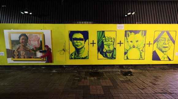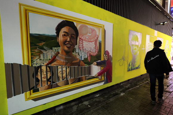 그 옆에는 윤 후보의 장모로 추정되는 중년 여성과 전두환 전 대통령으로 보이는 남성의 그림, 무속 논란을 일으켰던 손바닥 ‘王(왕)’자, 사과 희화화 논란이 일었던 ‘개 사과’ 그림이 그려진 그래피티 아티스트 ‘닌볼트’의 벽화가 나란히 공개됐다.