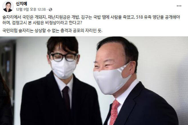 신 대표는 “술자리에서 국민은 개돼지, 재난지원금은 개밥, 김구는 국밥 땜에 사람을 죽였고, 518 유족 명단을 공개해야 하며, 검정고시 본 사람은 비정상이라고 한다고? 국민의힘 술자리는 상상할 수 없는 충격과 공포의 자리인 듯”이라는 짧은 메시지를 남겼다.