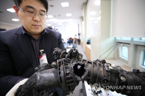 구멍난 BMW EGR 쿨러 (서울=연합뉴스) 안정원 기자 = 24일 오전 서울 종로구 도렴동 정부서울청사에서 한국교통안전공단 관계자가 BMW 사고차량의 구멍난 EGR 쿨러를 들어보이고 있다. 민관합동조사단은 EGR쿨러 균열로 인한 냉각수 누수가 화재 발생원인이나 EGR 설계결함으로 냉각수 끓음 현상(보일링)을 확인했다고 밝혔다.