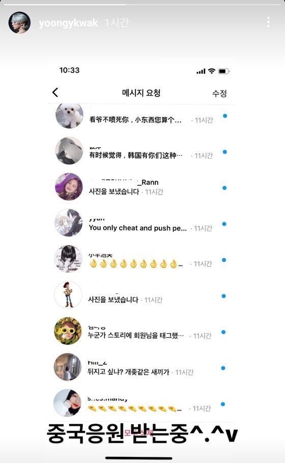 하지만 이런 중국인들의 공세에도 곽윤기는 5일 자신이 받았던 욕설이 담긴 다이렉트 메세지(DM)를 "중국 응원받는 중^.^"이란 글과 함께 자신의 인스타그램 스토리에 업로드하며 전혀 신경을 쓰지 않는 듯한 모습을 보였다.