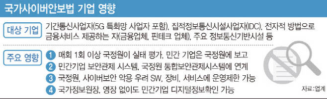 현재는 공공기관은 국정원(국가사이버안전센터), 민간분야는 과학기술정보통신부, 개인정보보호 정책은 개인정보보호위원회가 나눠 맡는 구조인데, ‘국가사이버안보법’이 국회 문턱을 넘으면 국정원이 민관을 아우르는 핵심부처(컨트롤 타워)가 돼 민간까지 통제하기 때문이다.