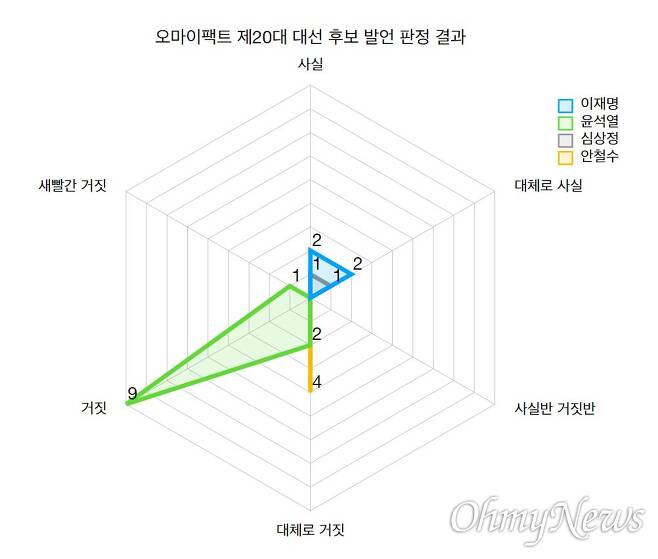 윤석열 국민의힘 대통령 당선인이 제20대 대선 기간 오마이뉴스 팩트체크 결과 대선 후보 4명 가운데 '거짓' 판정을 가장 많이 받은 것으로 나타났다.