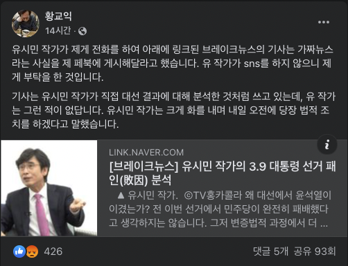 참고링크 : [사과문]“유시민 작가의 3.9 대통령 선거 패인(敗因) 분석”은 ‘가짜 글’....사과드립니다.