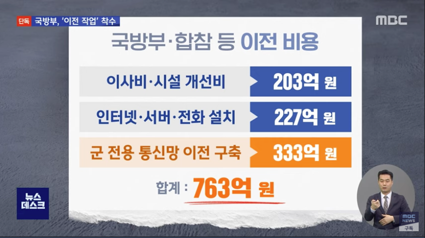 이사와 시설 개선에 203억 원, 인터넷, 서버 이전 등에 227억 원이 들어가고, 여기에 군 전용통신망 이전 구축에 추가로 333억 원이 소요돼 모두 763억 원이 드는 걸로 추산된다고 언급되었습니다..