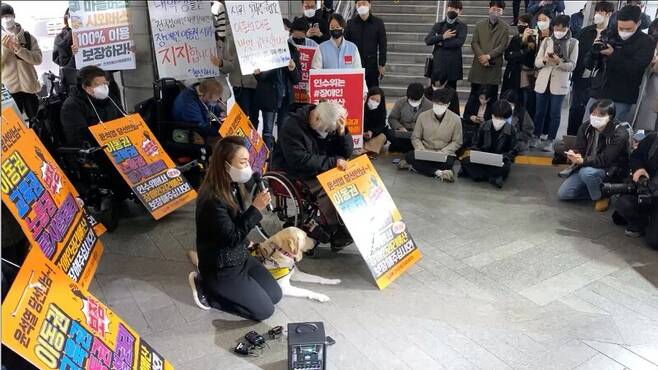 김예지 국민의힘 의원은 28일 오전 출근길 지하철 3호선 경복궁역 승강장에서 열린 전장연의 출근투쟁 집회에 참여해 “정치인의 한 사람으로서 큰 사고나 중상을 당해야 언론이 주목하고 그때서야 정치권이 관심을 갖는다”며 “정치인의 한 사람으로서 책임 통감하고 여러분께 정말 죄송하다는 말씀을 드린다”고 사과했다.
