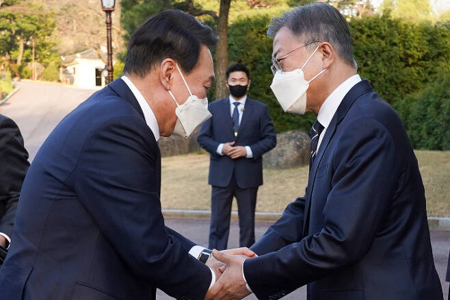 문재인 대통령과 윤석열 당선인이 28일 청와대 상춘재에서 역사적인 회동을 갖고 용산 이전 등의 현안을 논의했다. 문 대통령은 "대통령 집무실 이전에 대한 판단은 차기 정부의 몫"이라며 윤 당선인의 용산 이전 계획에 협조를 약속했다. 윤 당선인은 최초 계획과는 달리 이명박 전 대통령의 사면 문제는 꺼내지 않았다.