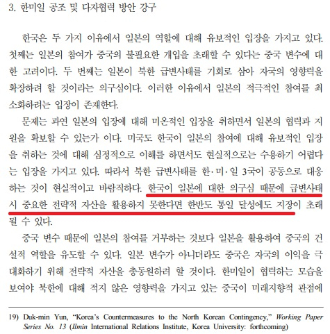김 전 차관은 논문에서 급변사태 시 미국의 도움을 받아 통일을 이룩해야 하기 때문에 미 측이 '범세계적 동반자'(global partner)'로 인식하고 있는 일본 역시 급변사태에 개입하는 게 알맞다는 주장을 펼쳤다. 미국이 한반도 정세를 '현상 유지'시키는 쪽으로 기울지 않도록 하기 위해 미국의 동맹인 일본도 한반도 판세에 동원할 필요성이 있다는 논리다.